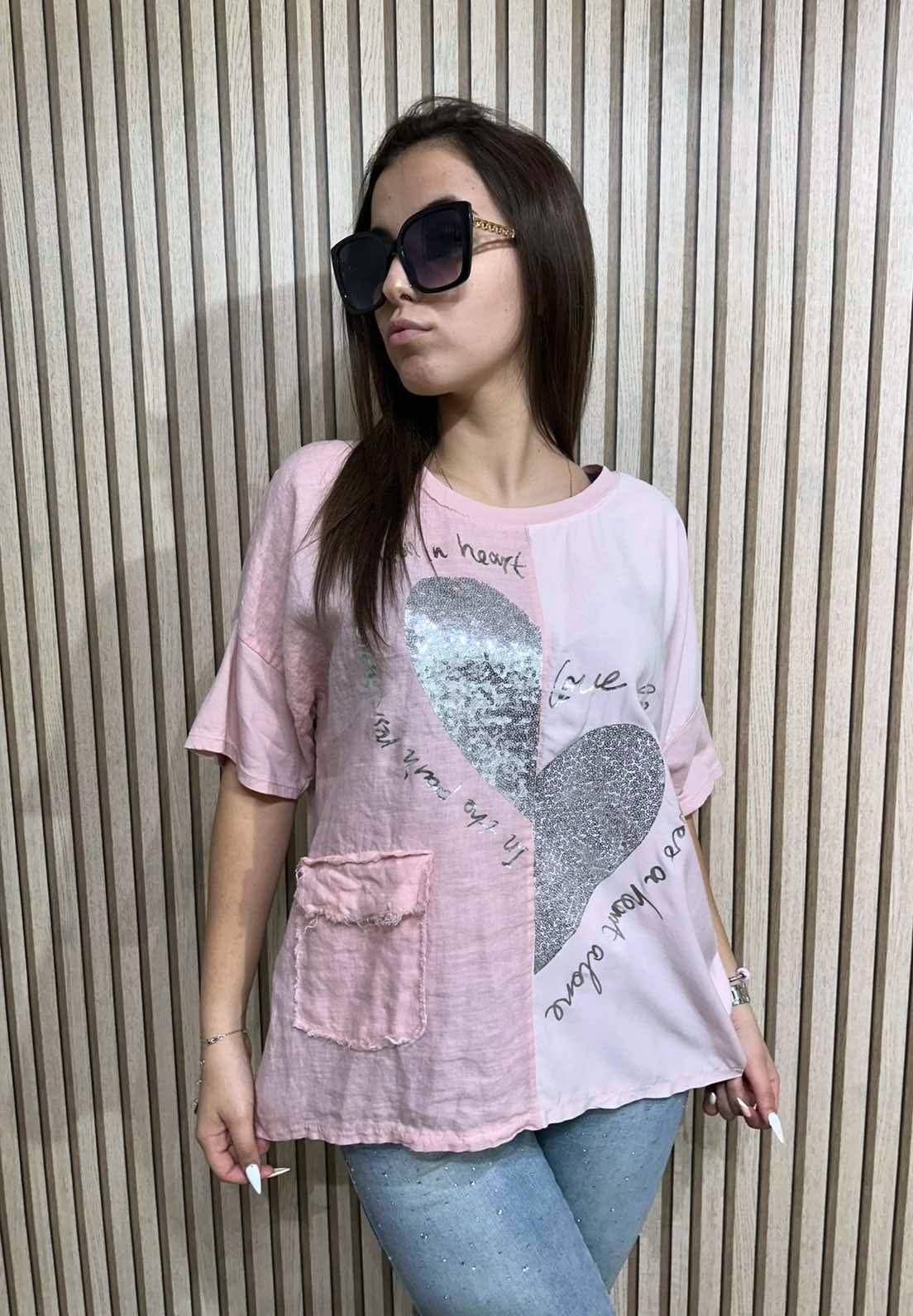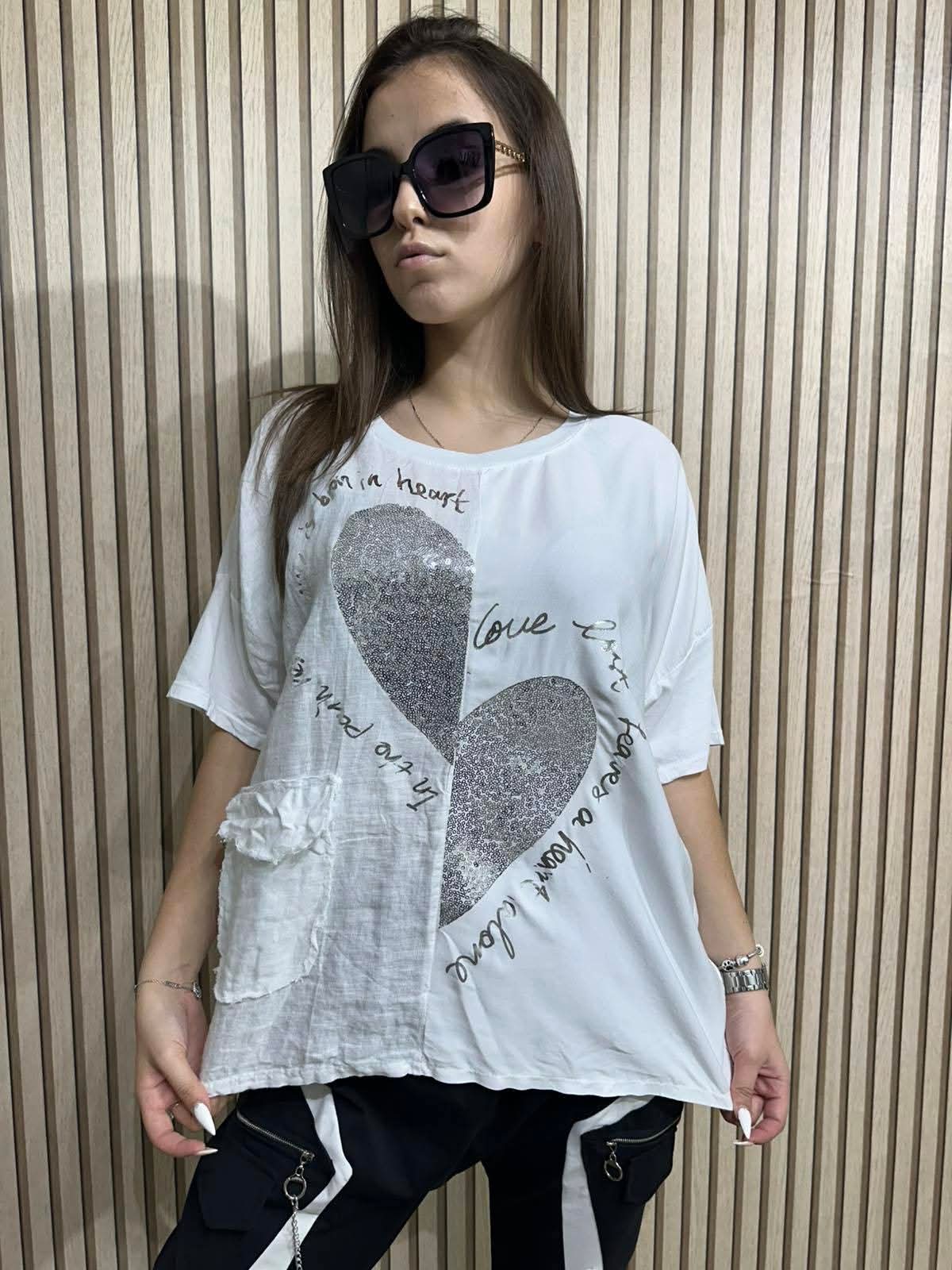 Čudovita majica, mešanica bombaža in lana. Srebrni dodatki jo naredijo prav posebno.