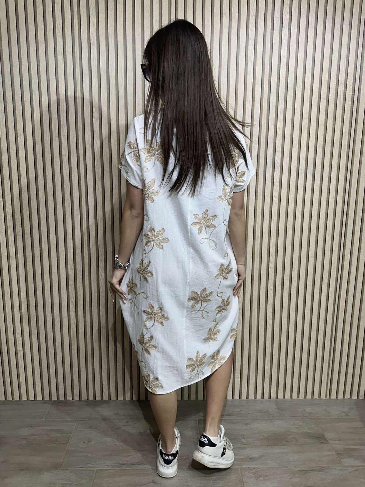 Čudovita obleka balončkastega kroja z žepi in vezenimi rožami